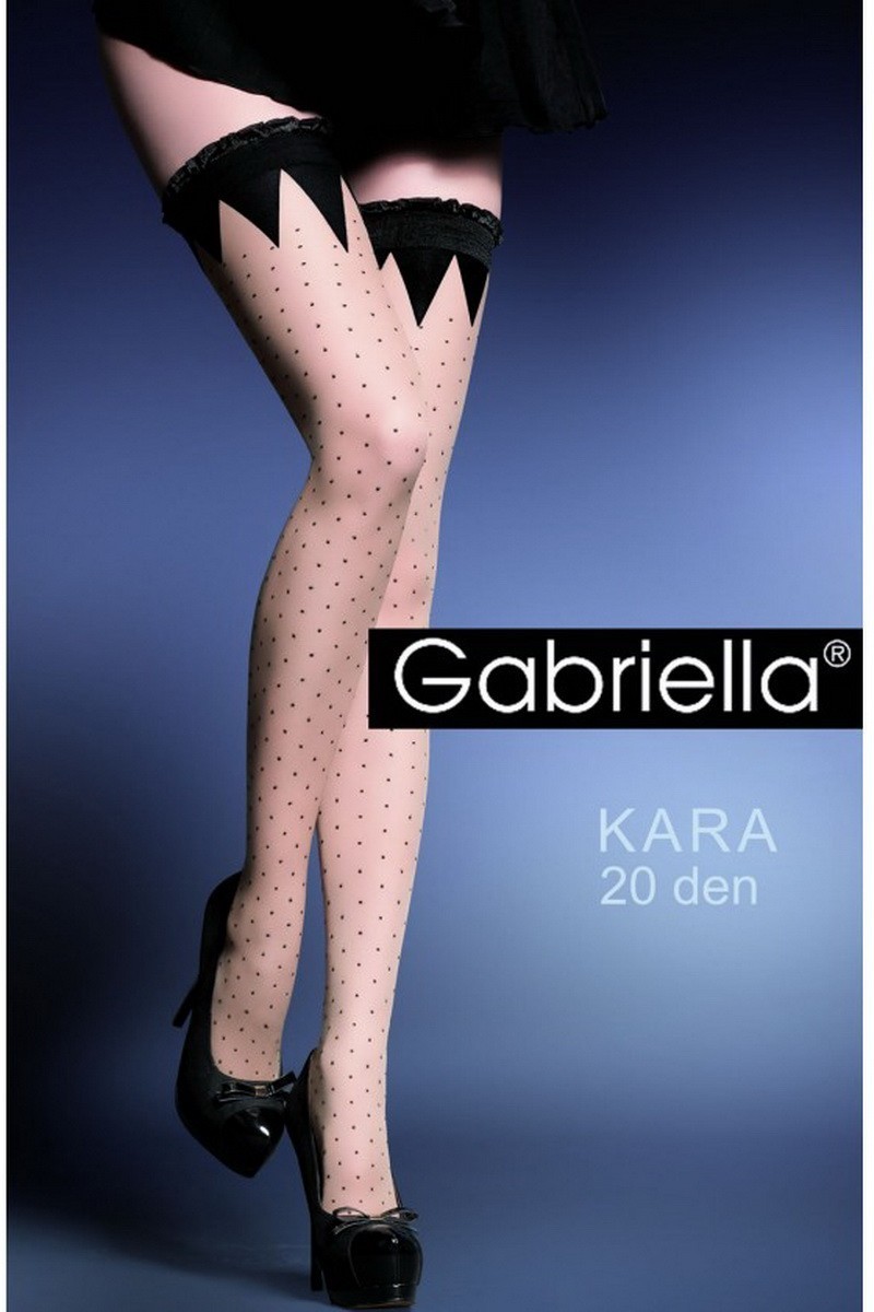 Gabriella Kara este un dres 20 den cu adeziv, fin cu un model clasic dar foarte elegant in puncte. Banda simpla de elastic este accesorizata cu volanase in partea superioara si cu model in triunghiuri 40 den in partea inferioara.