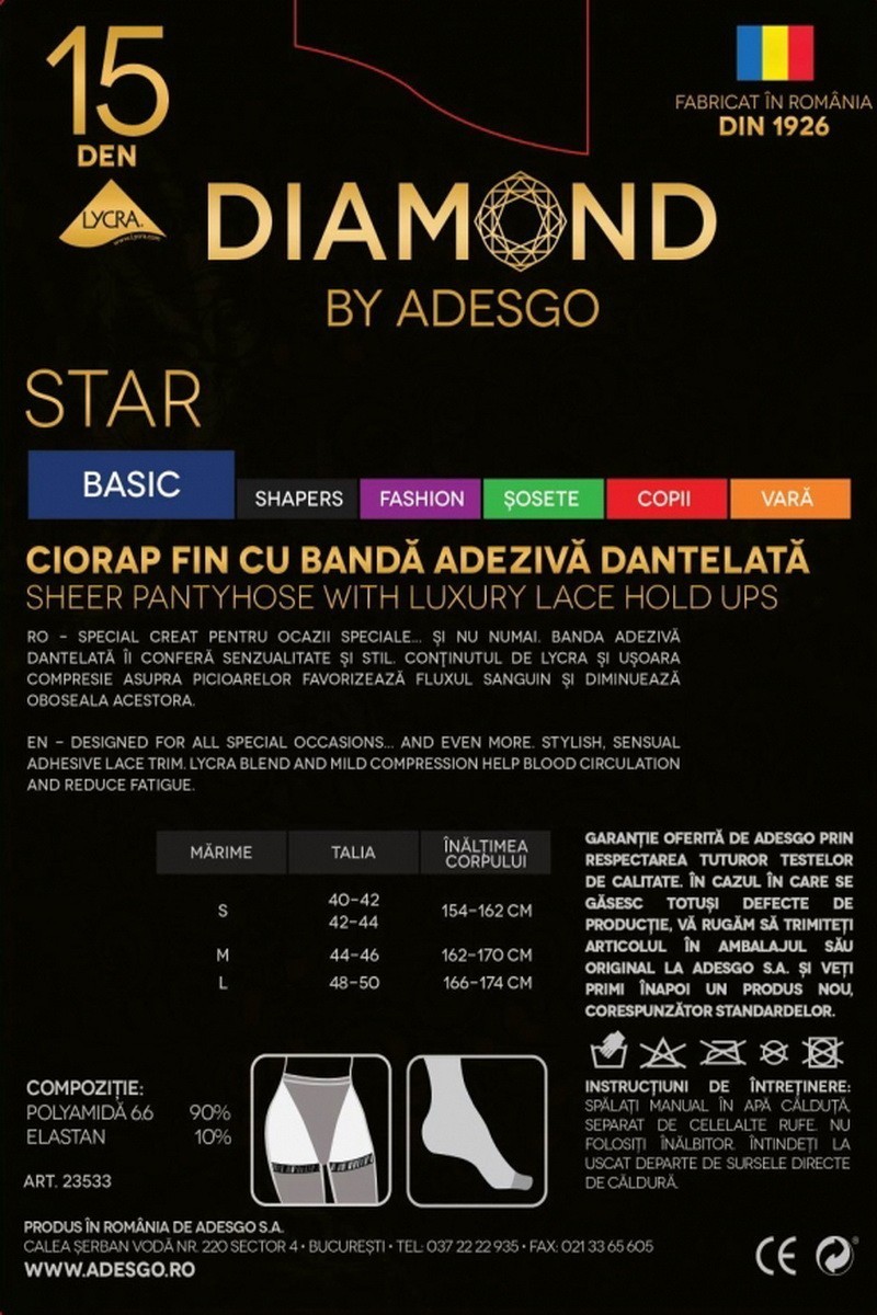 Diamond by Adesgo este un brand cu traditie care, in cei peste 90 ani, a castigat increderea femeilor de toate varstele. Datorita calitatii incontestabile a gamei complete de dresuri si lenjerie intima, femeile aleg Diamond by Adesgo fie ca vorbim despre dresurile de zi cu zi, fie ca isi doresc modele speciale sau texturi unice. Si, pentru ca Diamond a inteles nevoia femeii de a exprima frumusete si perfectiune, nu va inceta niciodata sa inoveze.
