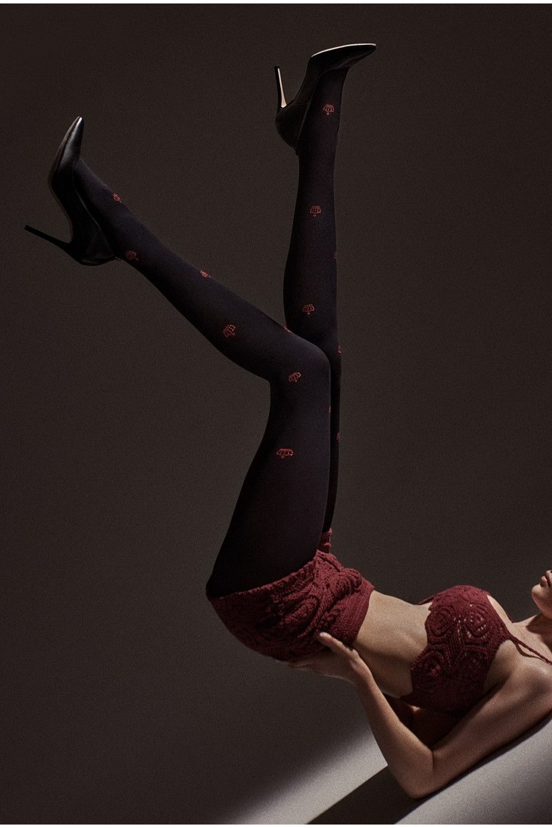 Dres 60 den , lycra , opac , semimat, cu model cu coroane de culoare aramie pe toata suprafata piciorului.