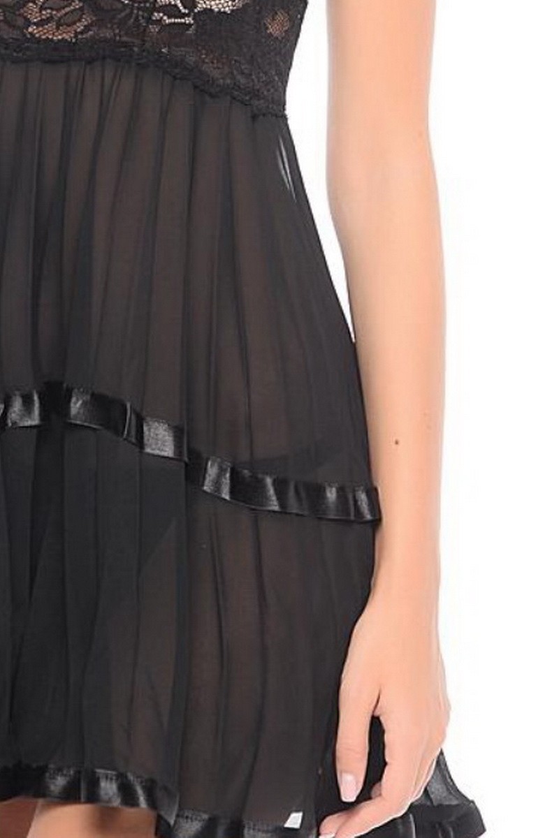 Babydoll confectionat din tulle de culoare neagra, cu pliseuri, decorat cu aplicatii satinate si fundita sub sani.