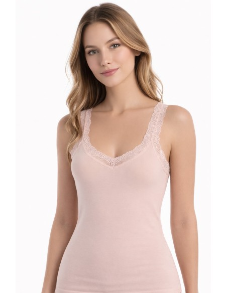 Maiou dama din bumbac fin si elastic, cu bretele late si decolteu in V decorat cu dantela delicata.