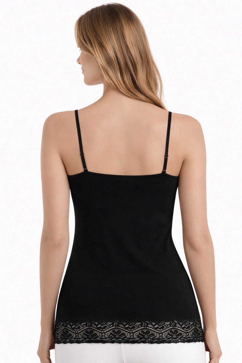 Maiou dama elegant, realizat din bumbac moale si elastic, cu bretele subtiri si insertie delicata din dantela in partea superioara.