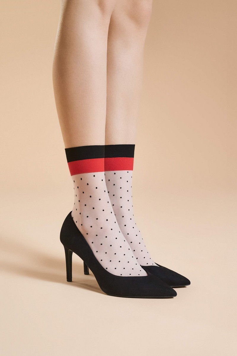 Sosete 1/4 cu model , fine cu buline in contrast si banda eleganta in dungi orizontale rosu si negru.