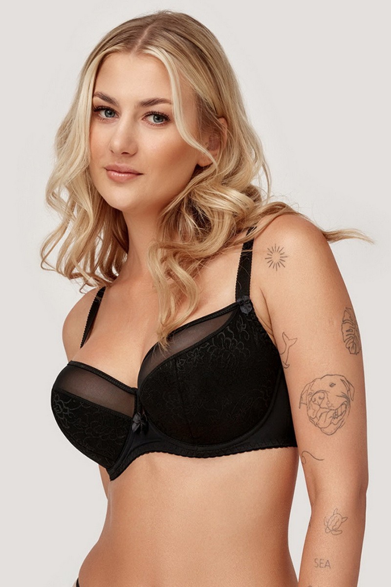 Cupa intreaga din burete subtire captusita cu bumbac la interior ofera confort, iar insertiile din dantela delicata si plasa transparenta adauga un plus de rafinament. Bretelele late, fixe, reglabile permit ajustarea precisa, parti laterale late, balene laterale pentru o mai buna sustinere, inchidere in spate in trei puncte reglabile in functie de lejeritatea dorita.