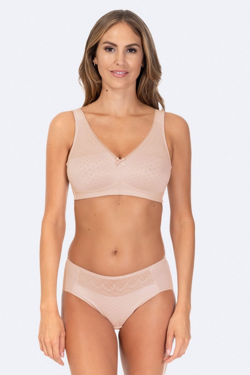 Cupele sunt decorate cu dantela in partea de sus si cu material perforat in partea de jos, pentru a ajuta pielea sa respire.